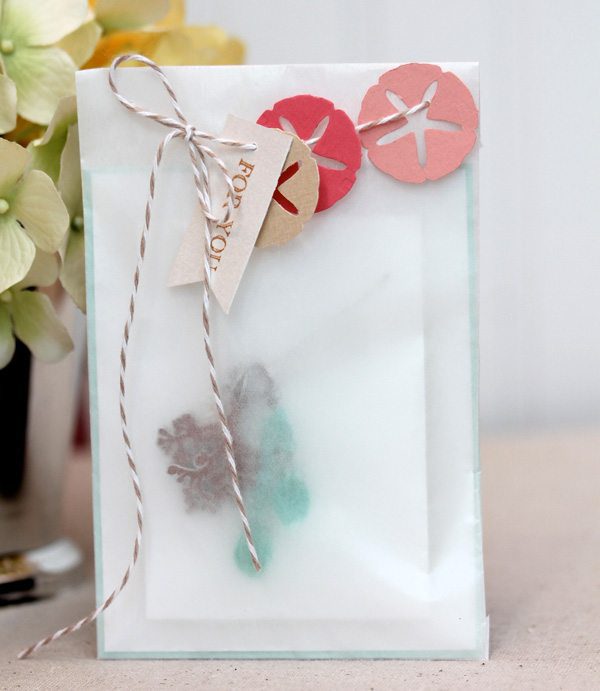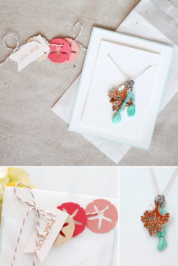 For this packaging, I created a layered flat card and punched holes in the top-most layer to hold the necklace. This card fit perfectly into a glassine bag, which I embellished with a few sand dollar paper punches, a banner tag and some baker’s twine. I love how the sand dollars coordinate with the nautical theme.