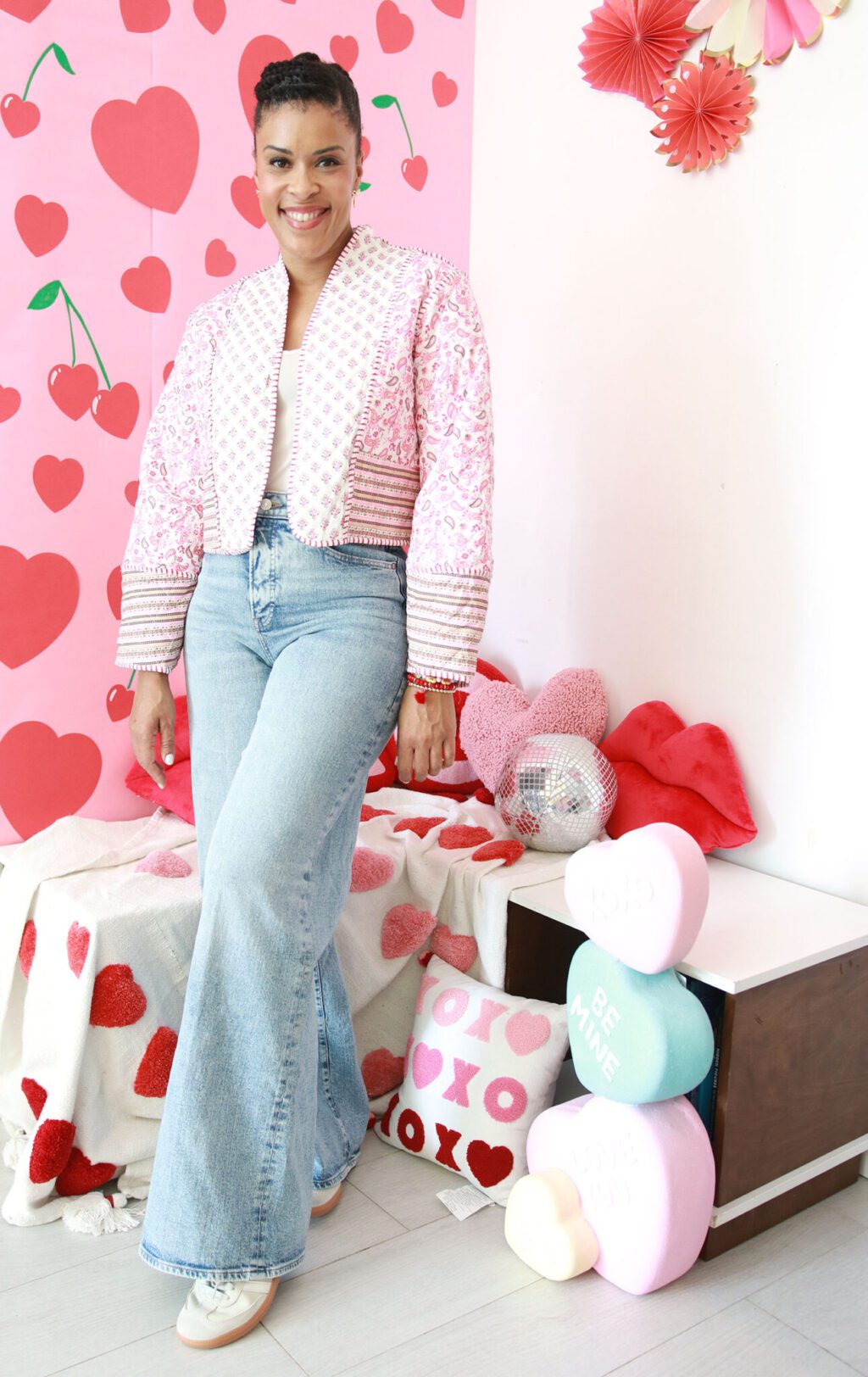 Quilted jackets are everywhere and this one is begging for some Valentine’s Day love. Pair with wide leg jeans and a pair of flats or sneakers…and you’re good to go!
