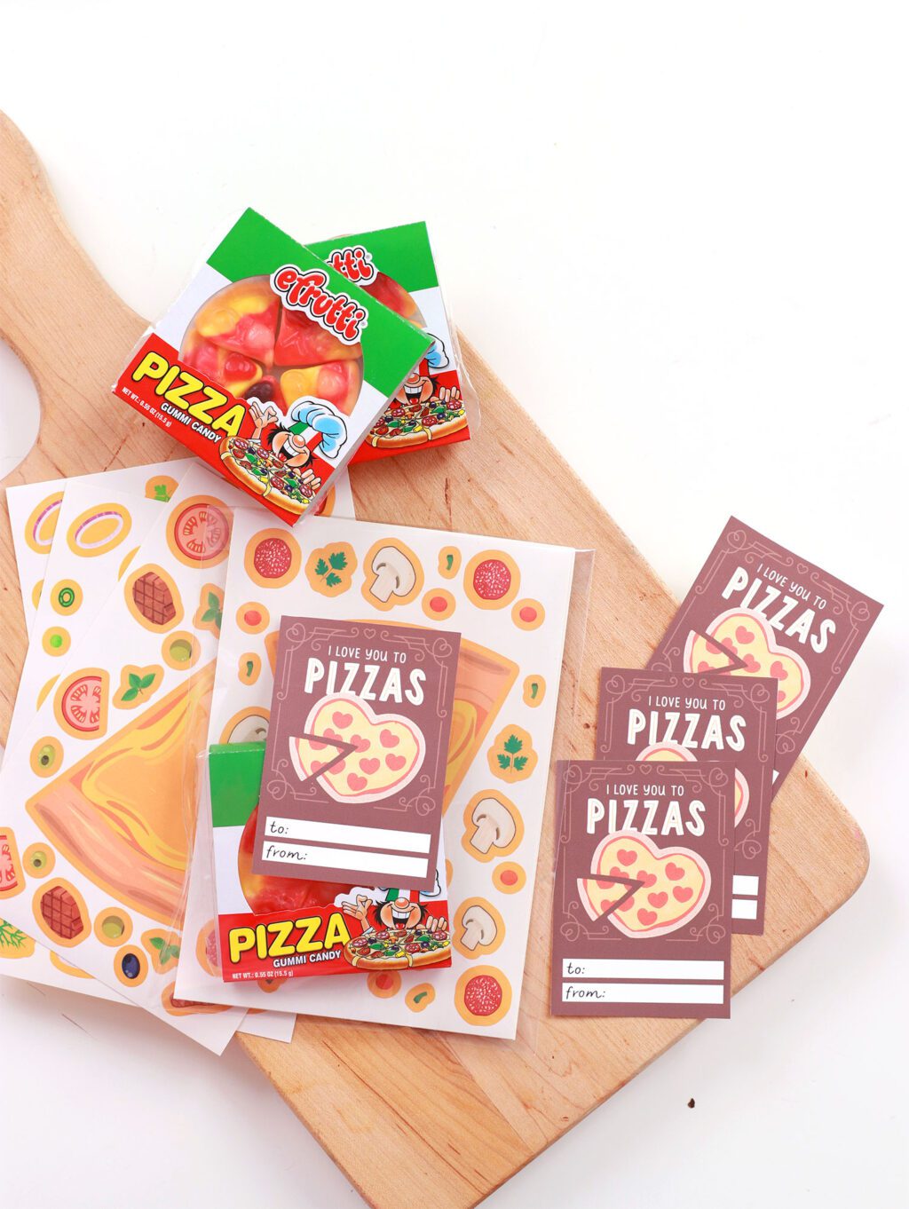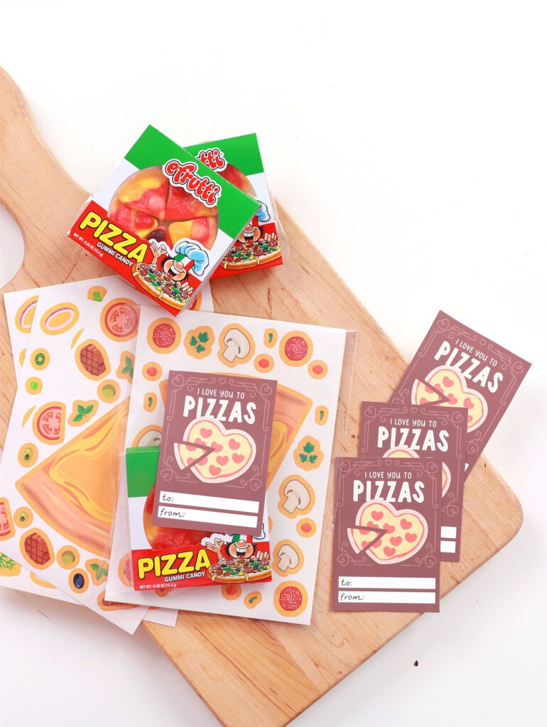 My 9 year old son wasnt too keen on the pink popsicles so he opted for a pizza themed valentine! I started with cellophane bags and filled them with stickers and treats.