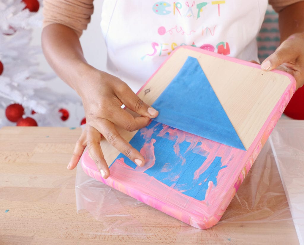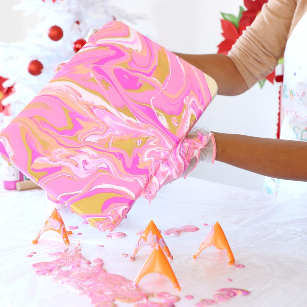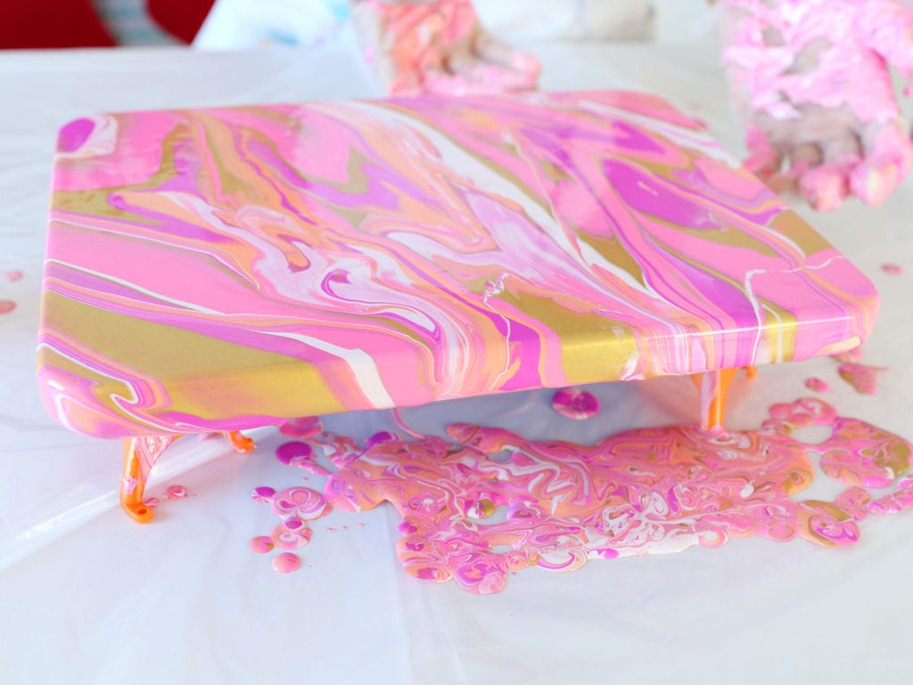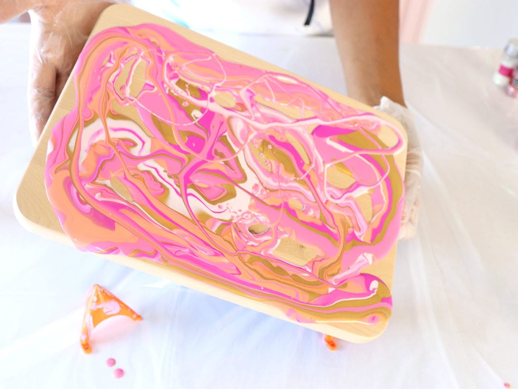 Once you’ve emptied all the cup, hold the stool top and begin tilting it to spread the paint and create your marbled paint effect.