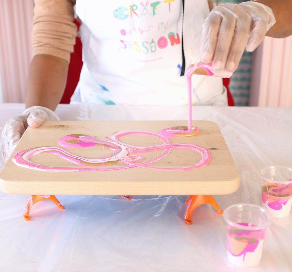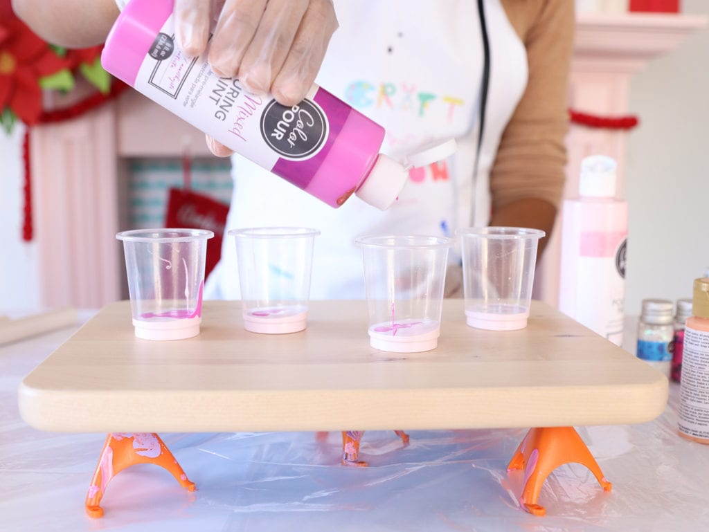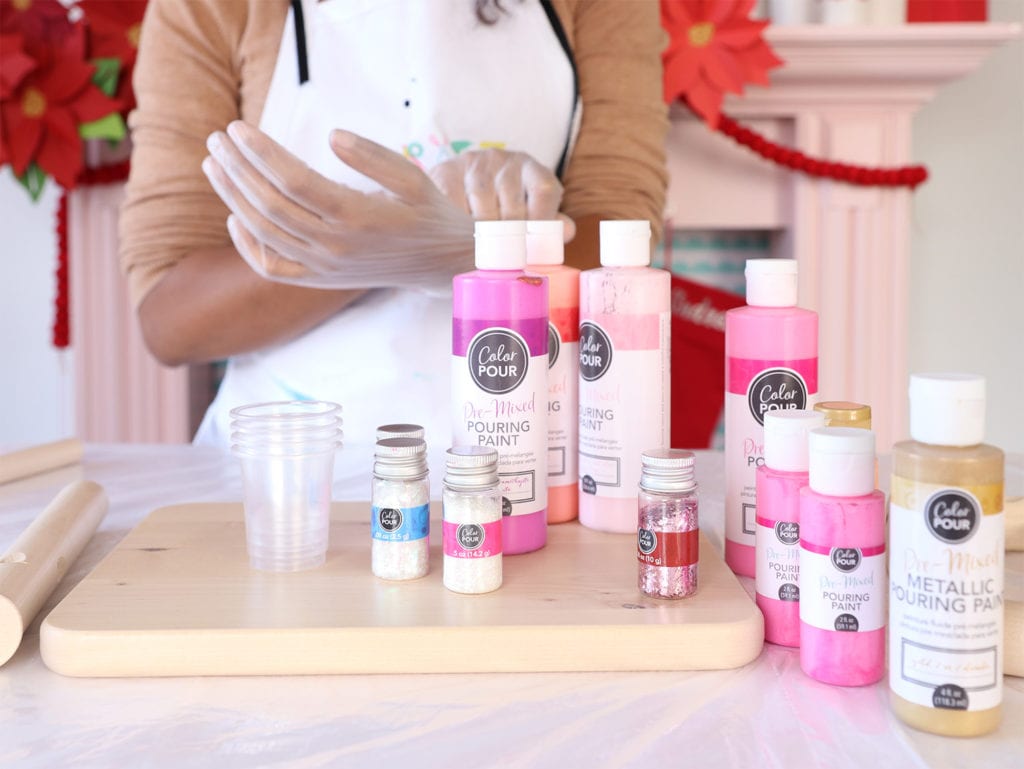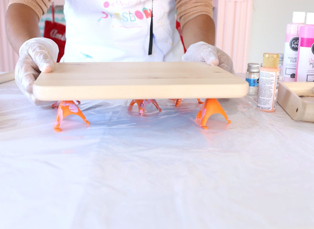 Gather your paint pouring materials! I’m using: Color Pour paint, rubber gloves (it can get messy), a plastic sheet to protect my work surface, plastic cups…and of course the top of the stool.