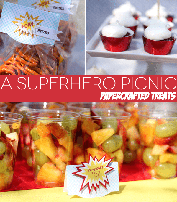 Did you see yesterday’s post?! Well, today I’m still in a superhero state of mind, but this time around, I’m sharing all the behind-the-scenes projects that went into executing my superhero picnic. Now, in the spirit of full disclosure, this party did take work, but not a ton. I put the whole thing together in a week – so it’s totally doable. My biggest strategy in creating this party was using the same stamps, dies and inks over and over and over…and over again. So keep reading and I’ll share several tips for executing your own paper crafted parties…and sparing your sanity in the process..