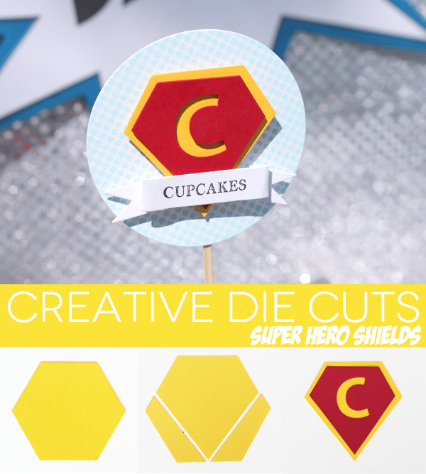 I knew I wanted to create classis superhero shields for this party, but I wasn’t sure how to make it happen. I could draw them and cut them out…OR I could do something way more creative and turn my hexagon dies into shields. Yep. I’ll go with option #2!