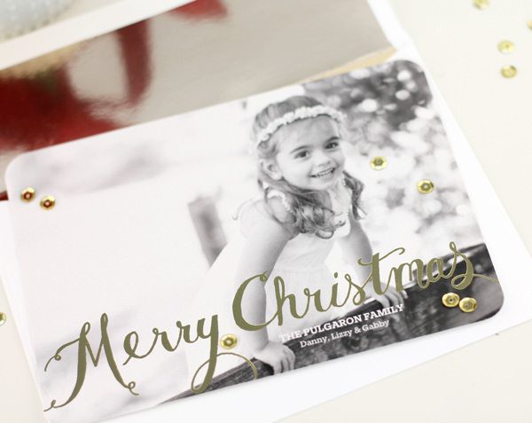 This “Gorgeous Bracket Christmas Card” design features a foil stamped sentiment across the front, which really pops against the black and white photo. I adhered a few gold sequins, which you can pick up from any craft store. When your friends open up the card, they’ll get double the sparkle and a bit of dimension as well.