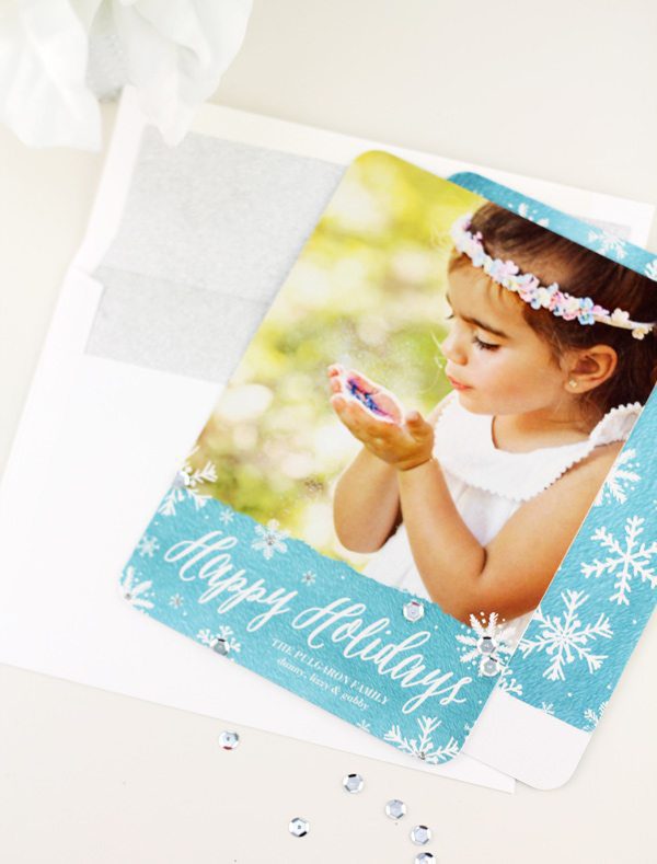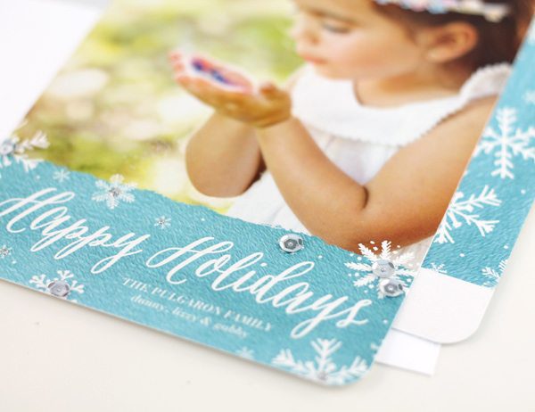 Apparently, sequins are all the rage in craftworld right now – so why not add them to your pre-printed holiday cards. You can order any of their cards with a Shimmer Pearl finish and several of their designs are available with foil stamping. With all that glitz, it only makes sense that a few sequins join the party. Just a dab of craft glue is all you need to strategically place a few sequins. Don’t go overboard – four or so will do. Just enough to add some texture and sparkle!
