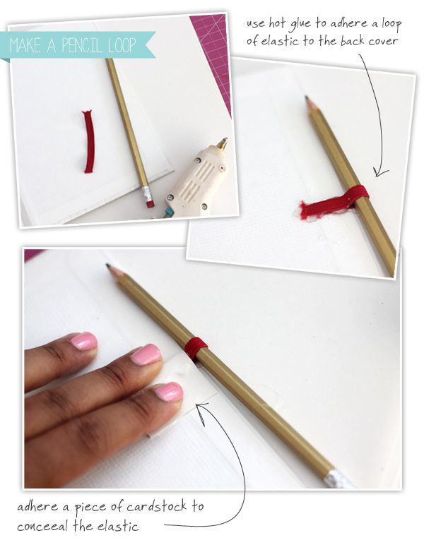 With all the making of lists and checking them twice – I thought it’d be great to add a pencil loop to the notebook. You’ll love how easy this is. You’ll need a piece of elastic that is 1/4″ – 1/2″ in width. You can find this at any fabric store.