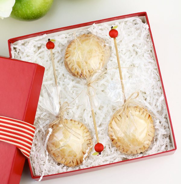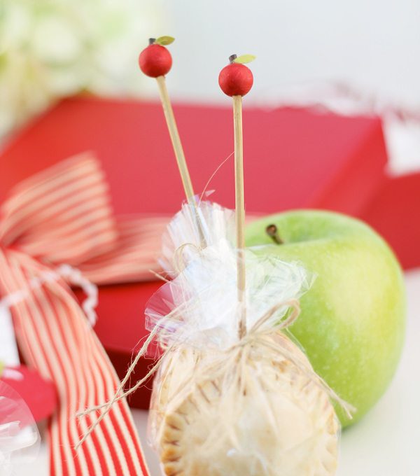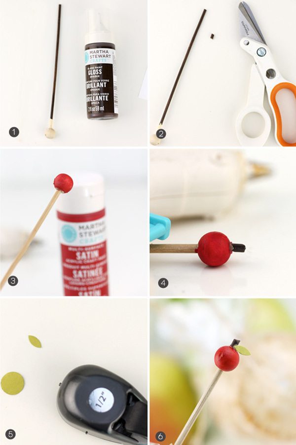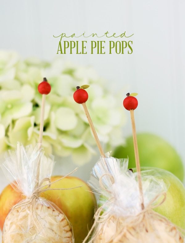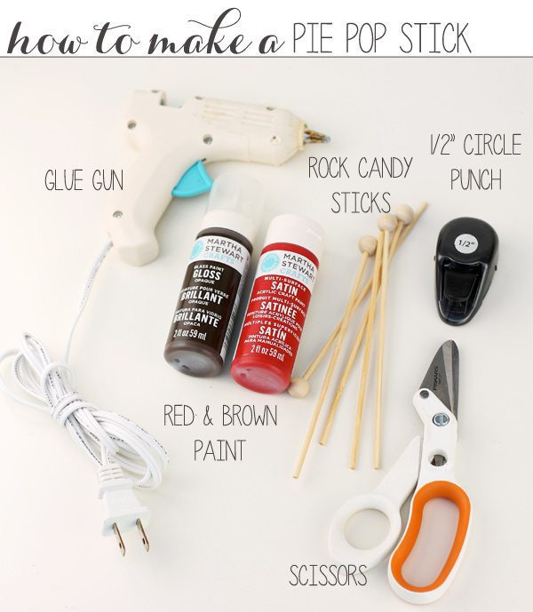 IMPORTANT: For this project, I baked little mini apple pies on the end of each stick. Be sure to bake the pies BEFORE you do any painting or gluing! To make the mini apple pie pops, just use a circle cookie cutter to cut out pie crust. Sandwich some apple pie filling between two circle and pinch the edges closed with a fork. Very easy.