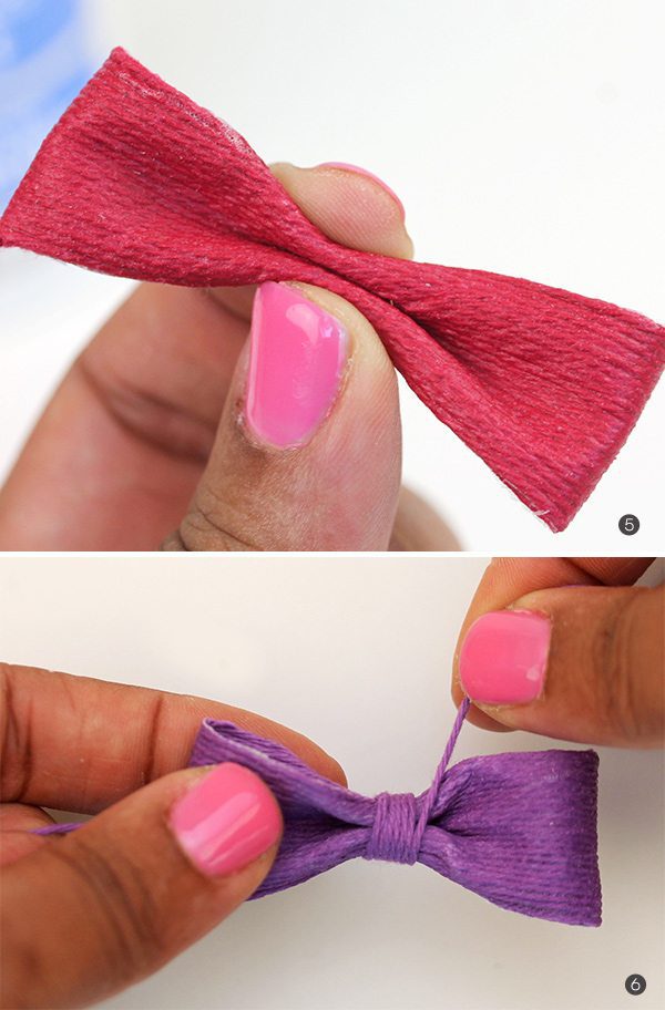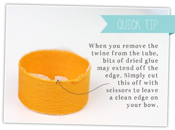 {6} Secure the center of the twine coil with more twine of the same color to create a bow shape. Tie a knot in the back to secure the center of the bow.