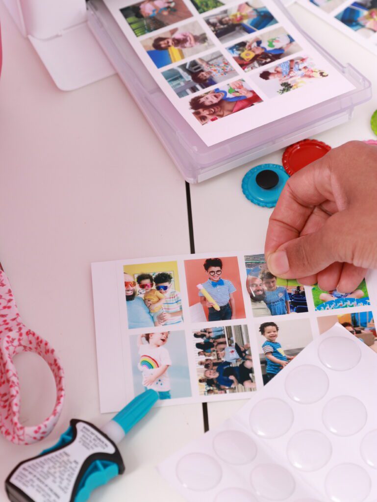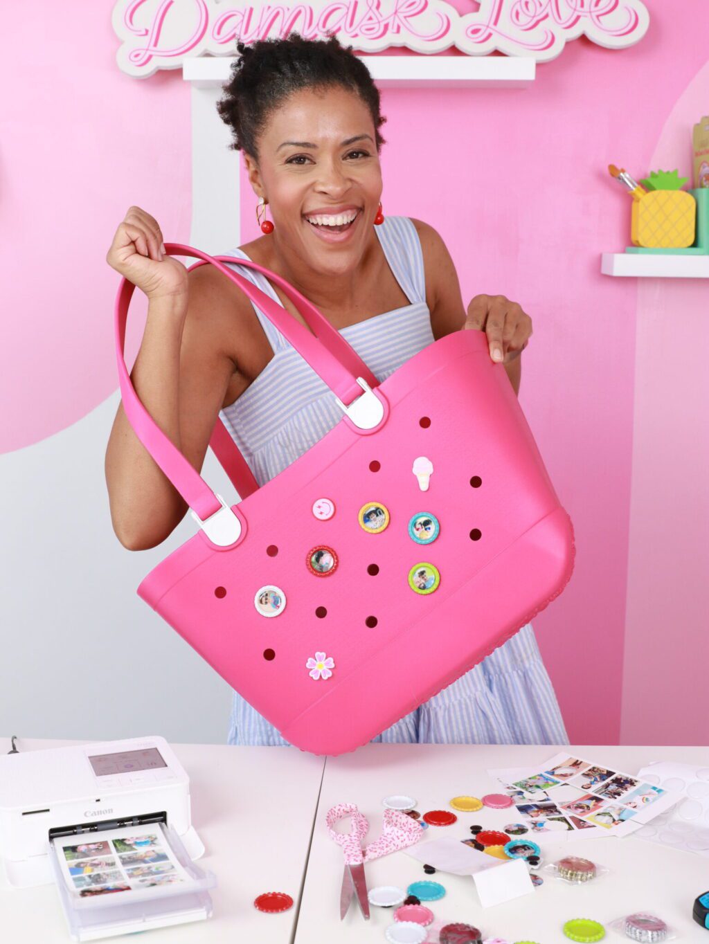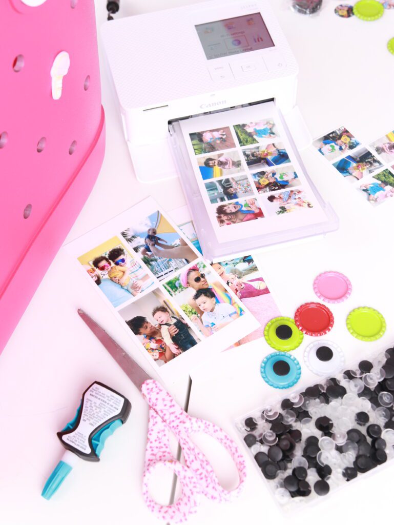 We’ve all seen the popular clog sandals with charm decorations on them…but what about making your OWN button charms that can be used in lots of ways.I’m using my Canon SELPHY CP1500 to make personalized photo charms for my giant tote bag that goes everywhere with our family. This might be the best Canon SELPHY craft idea you’ve ever seen!