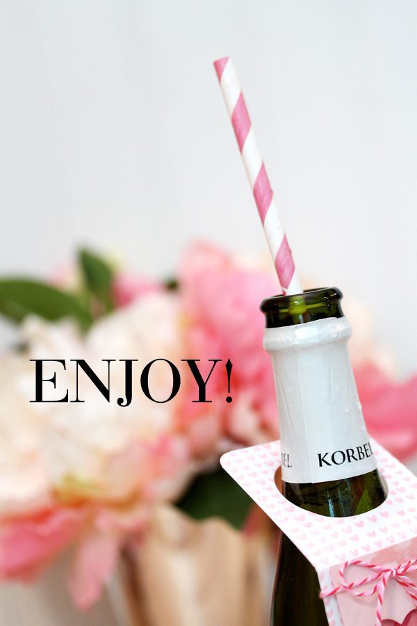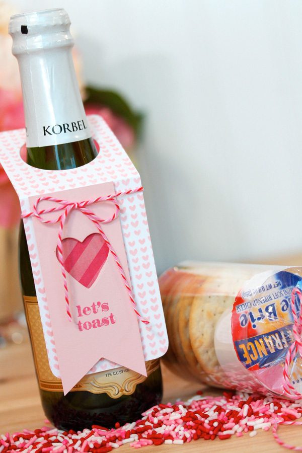 How fun would it be to pass out splits of champagne as Valentine’s day favors…for the 21 and up crowd only, of course! To add some V-Day flare to my bottle, I created a miniature bottle tag by simple die cutting a circle into a strip of cardstock.
