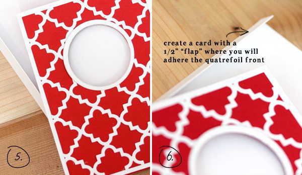 {6} To create a card from the quatrefoil card front, trim down the front of a 4bar cardbase so that only 1/2″ remains on the front. Adhere the quatrefoil cardfront to this flap.