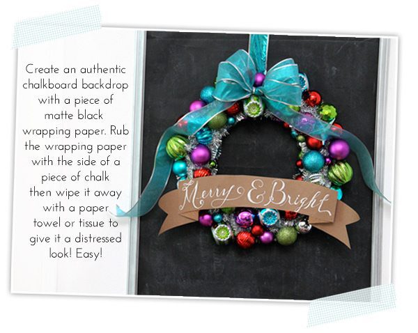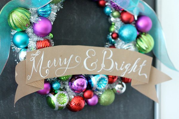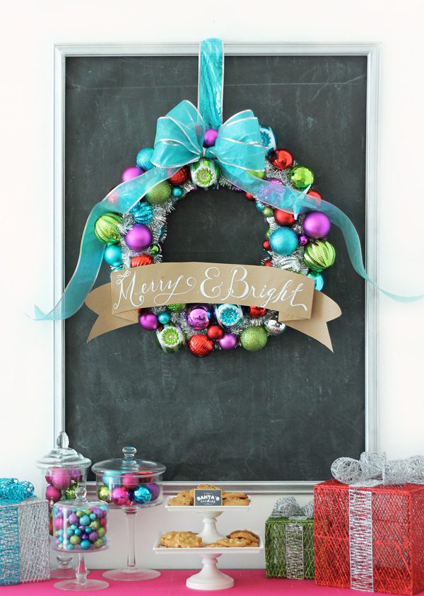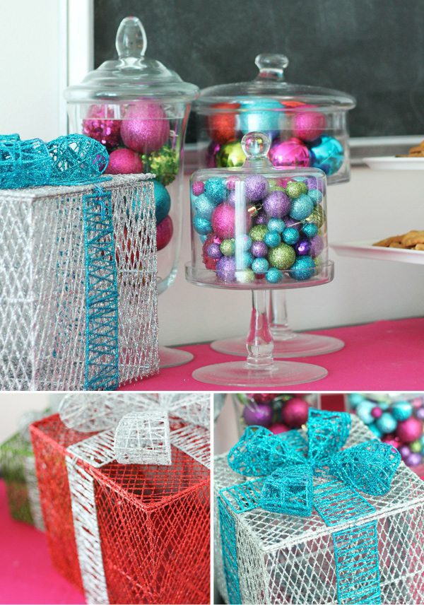 Jingle Bright Ornament Wreath | Jingle Bright Gift Boxes Decor | White Gel Pen | Kraft Paper | Matte Black Wrapping Paper | Moulding | Metallic Silver Spray Paint | Flat Corner Braces | Wood Filler | Apothecary Jars | Cake Stands