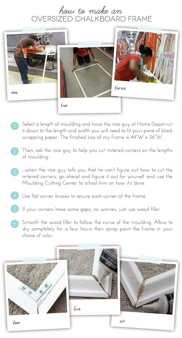 Once you’ve assembled the frame and the paint has dried, you’ll want to mount it around a piece of matte black wrapping paper to create an authentic chalkboard look. To hang up your oversized frame, just use Command Strips. Two or three on each side of the frame should hold it up nicely…and make it easy to take down.