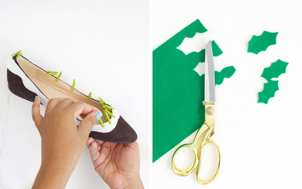 - Keep glueing and as you move around the shoe, use the clothespins to keep the felt in place as you move around the curves. Then cut holly leaf shapes from the green felt.