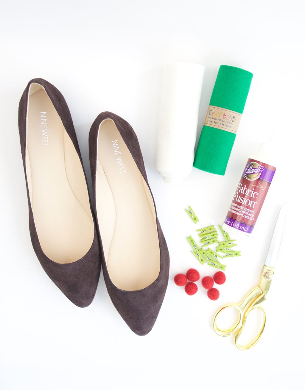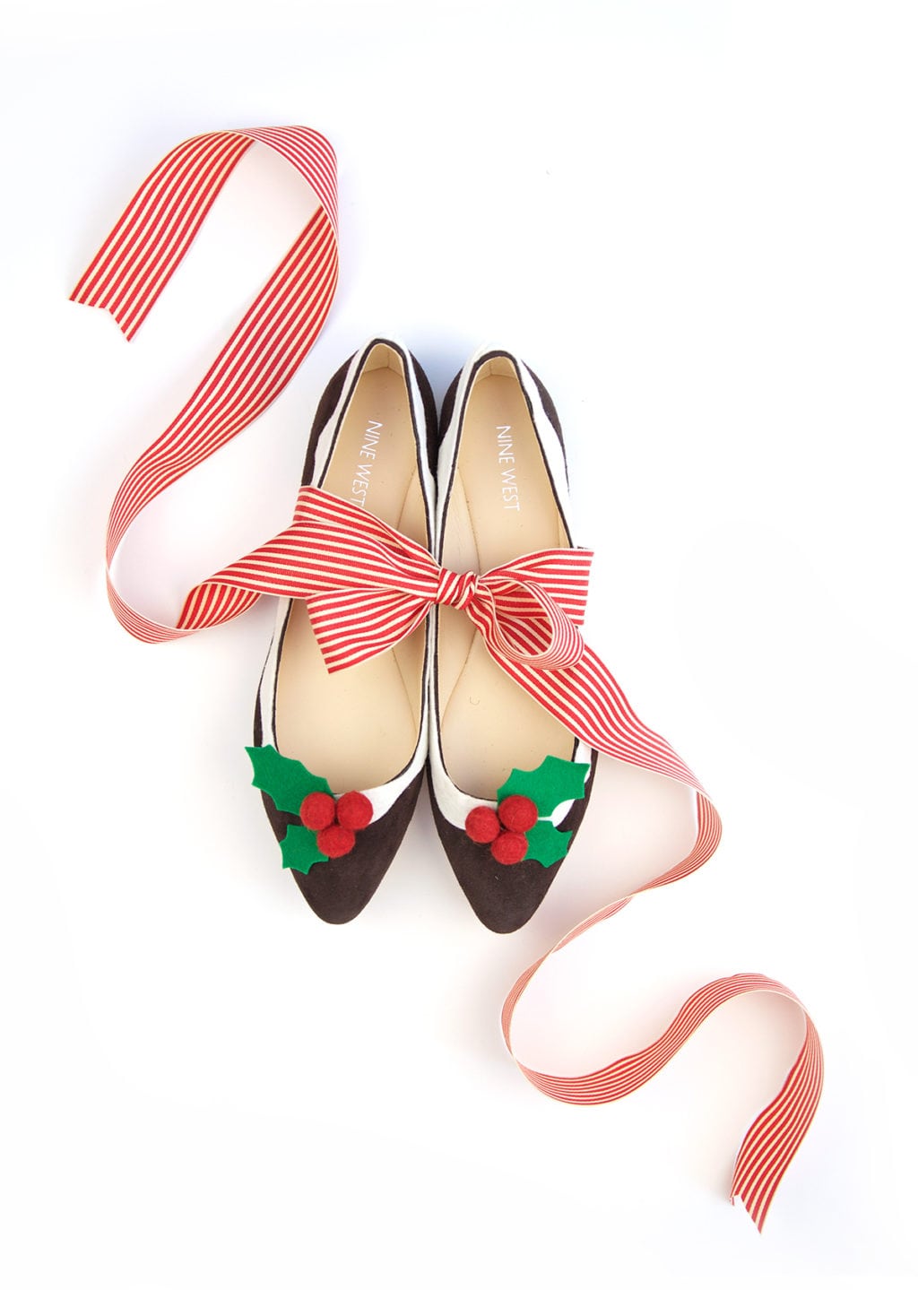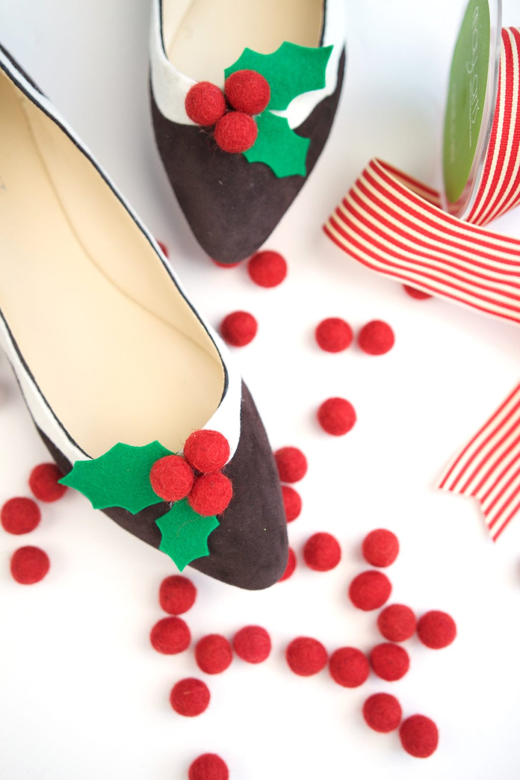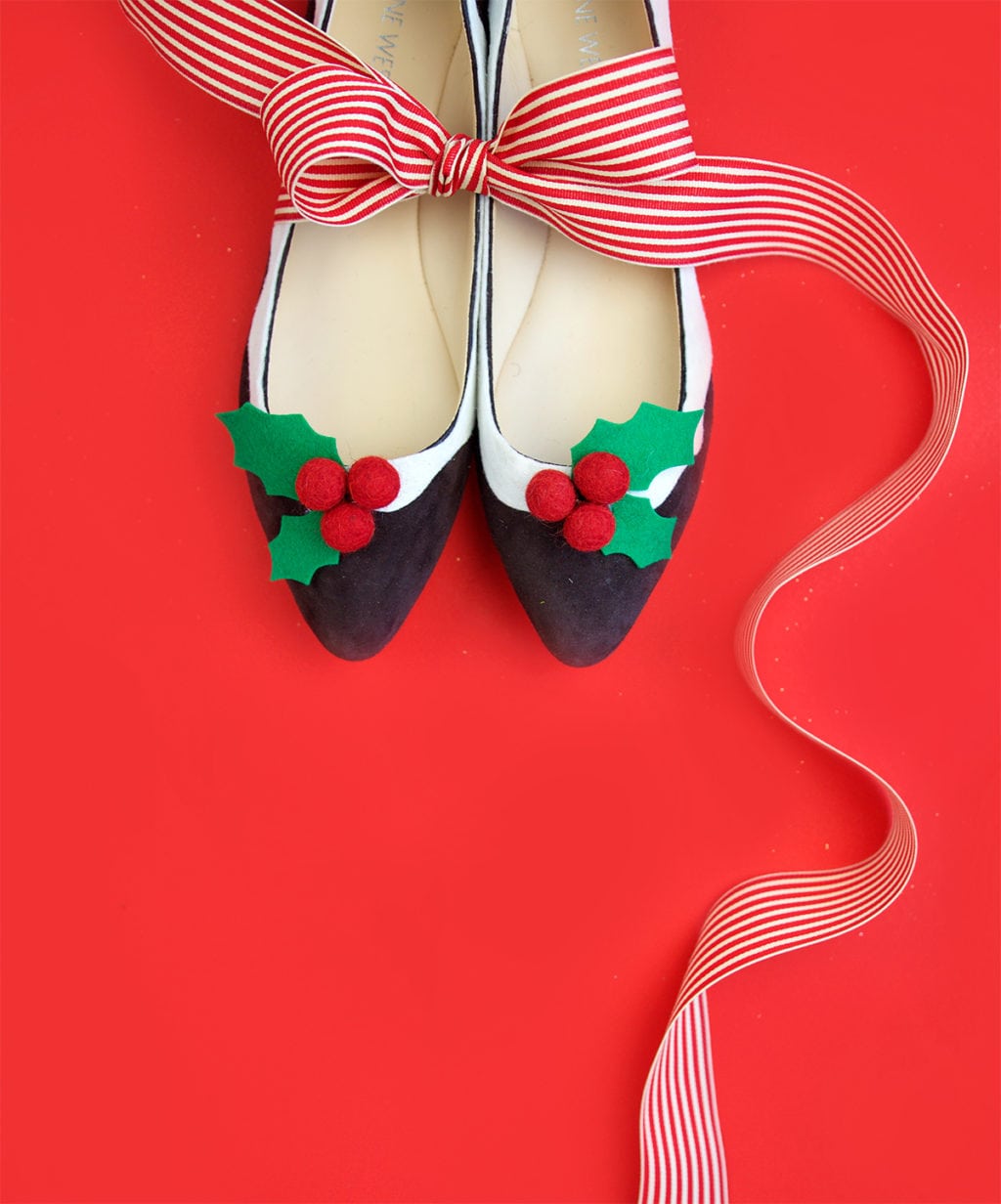 - Last up, adhere the holly leaves and the felt balls to the front of the shoe. Note: Don’t use a hot glue gun for any of this. It will be too stiff when dry and won’t be comfortable to walk around in
