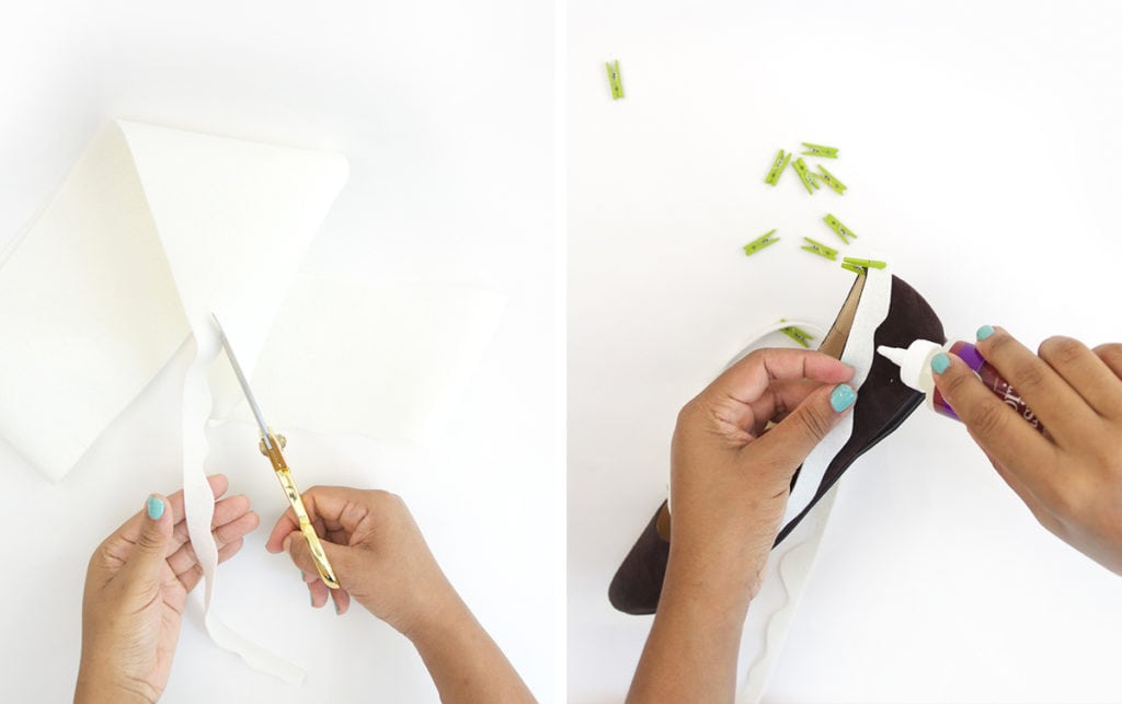 - Cut a thin wavy strip of white cardstock and begin adhering it along the edge of the shoe