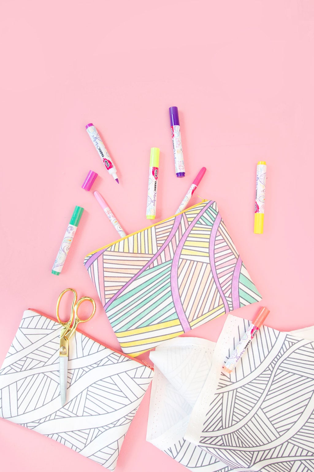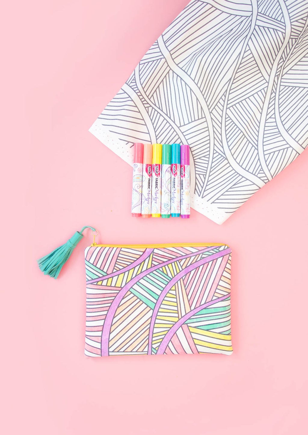 Now comes the honest truth. When I placed my order for these fabrics, I was completely and totally skeptical. I thought it would be cheap fabric with a filmy ink design on top of it. Not like the real-deal fabric from the actual fabric store. Welp, friends. I was wrong. When the fabric arrived in the mail, I opened it and proceeded to give Andrew a 30 minute talking-to about how impressed I was. He was riveted. (not really). But I was. Seriously, This stuff is legit. And now I’m on a mission to design all the fabrics – but first let’s just ogle at the pretty little makeup bag I created with this one. I had a blast coloring it in with fabric markers.