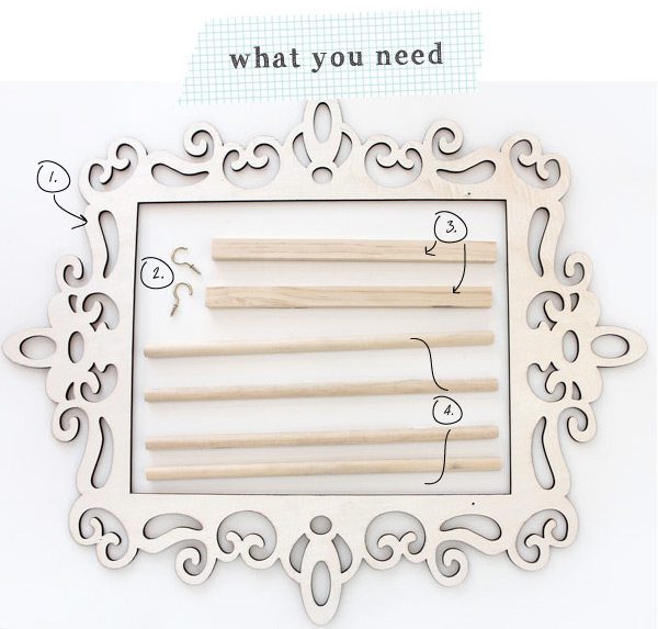 {5} Saw the circular dowels down to be slightly longer than the width of the frame opening. Slide dowels into place on the hooks and add spools of twine.
