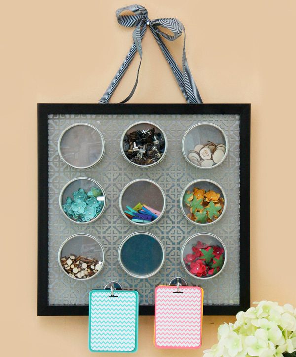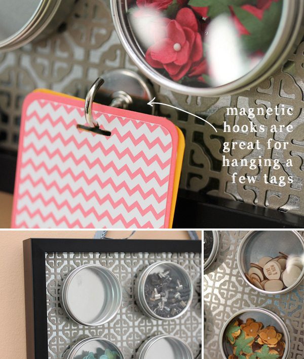 The nice thing about this project is that one sheet of the decorative aluminum can make two frames. I also like that storage solutions like this force me to limit my hoarding. If I only have nine of eighteen tins to fill, then that’s what I can keep. I can live without the rest, and I’ll be much happier with the decrease in clutter. After all, I’m pretty sure the floor is not intended to be one big shelf, right?!