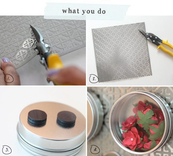 {3} Place two magnets on the back of each clear top tin. No need for any adhesive. Just put them there and they’ll stay in place. I prefer two magnets rather than one to ensure a better grip and to be sure that the container doesn’t spin around.
