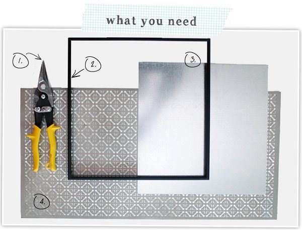 {1} Use your metal snips to cut the decorative sheet. If you would rather not purchase the snips, many of the employees at Home Depot carry a pair and if you ask nicely, they may just let you use them on site to cut through your sheet. I would just suggest that you arrive at the Home Depot with the frame you’ll be using. This way you can be sure that it fits the metal sheet once you’ve cut it.