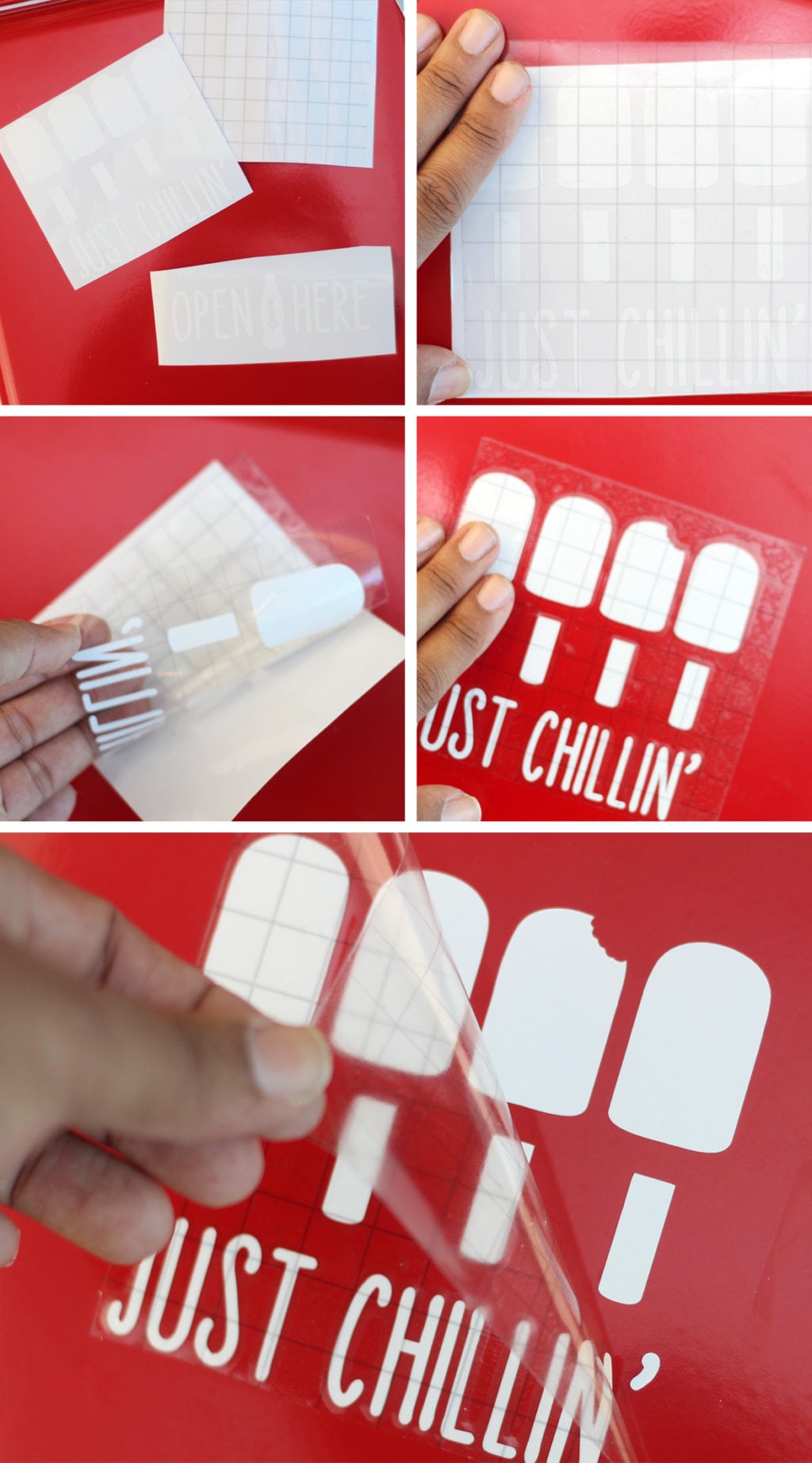 - Peel back the transfer tape, leaving the vinyl adhered to the cooler