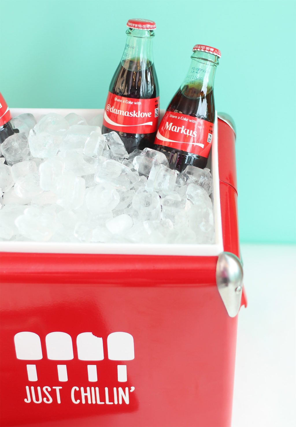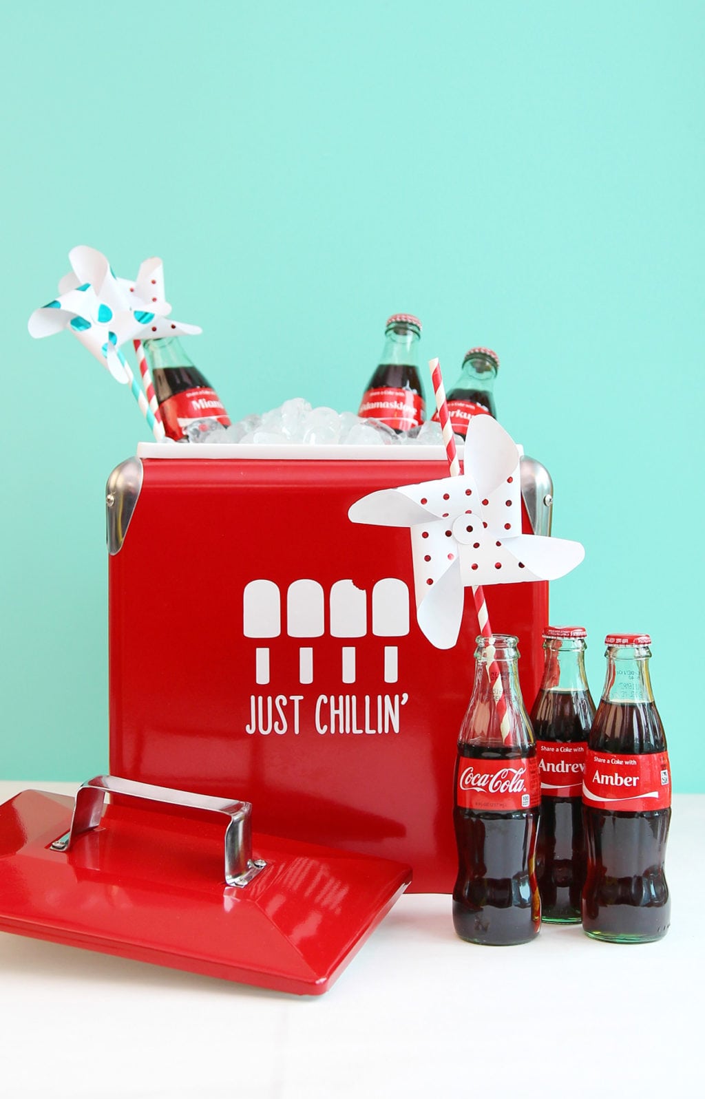 I picked up this vintage picnic cooler and dressed it up with crafty style. You can create an awesome, customized cooler for toting those Share-a-Cokes to all your sweltering summer soirees. I just added a little vinyl embellishment to a bold red vintage picnic cooler and it’s ready to go!