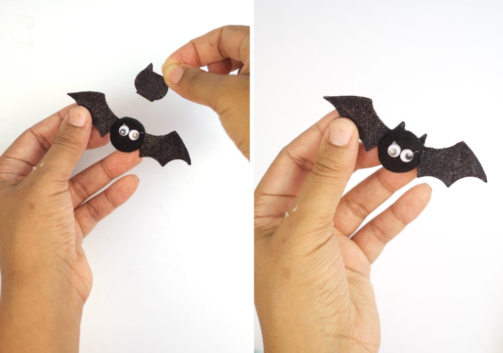 - Then take the head of the bat and hot glue it to the back so that the ears peek out from behind.