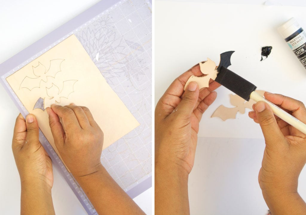 - To create the bat shapes, use your Cricut Explore to cut the shapes from tooling leather