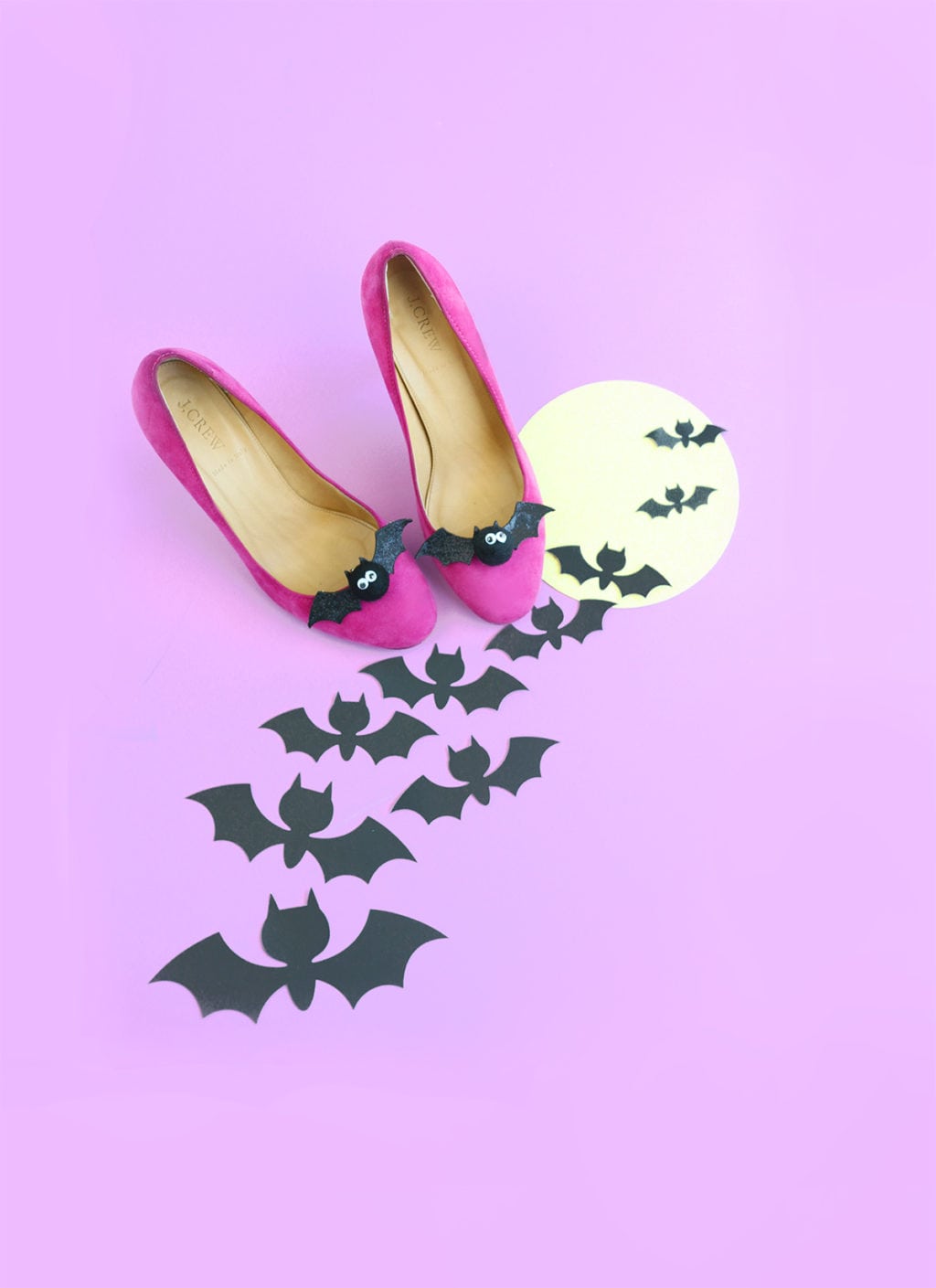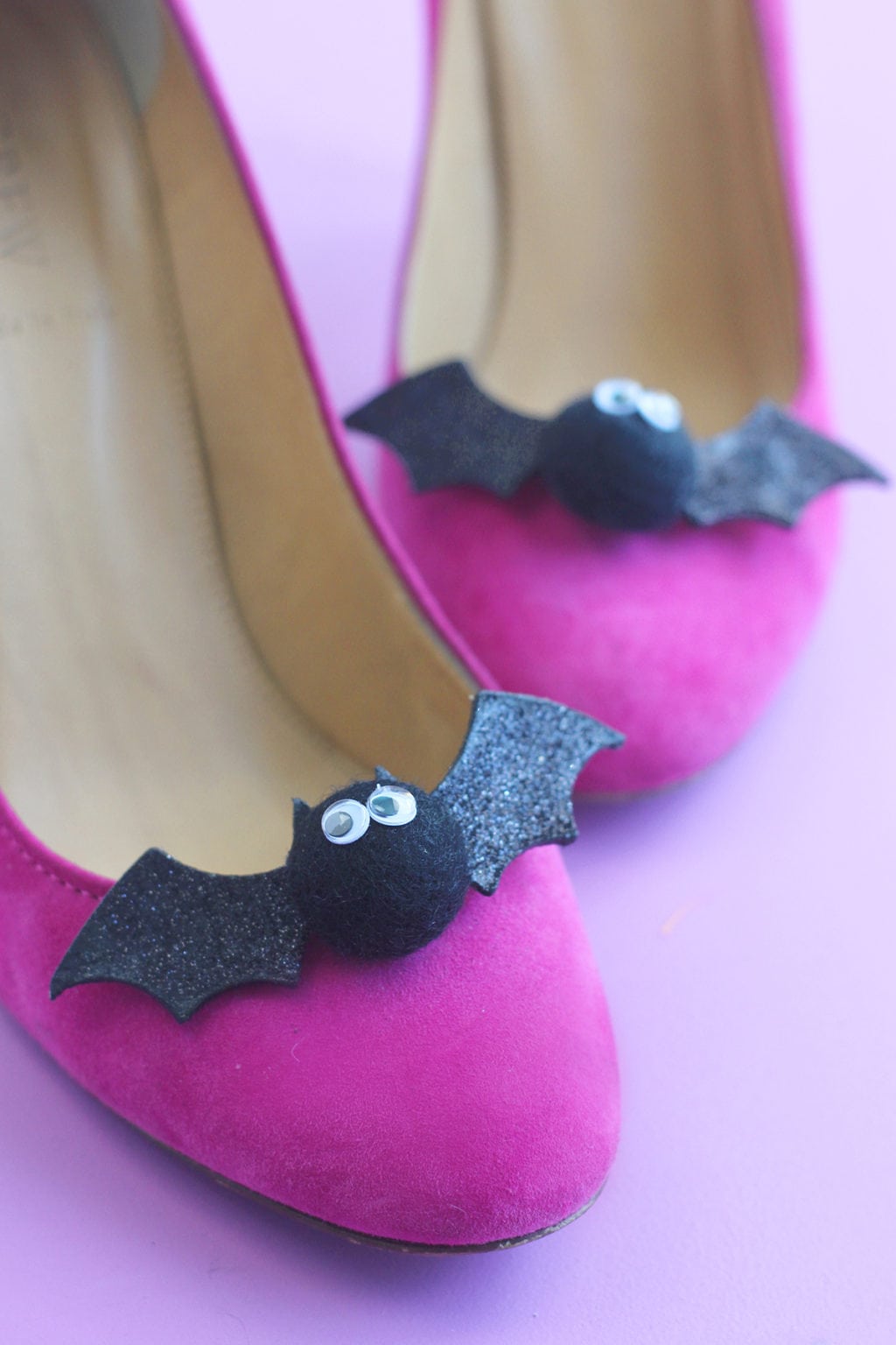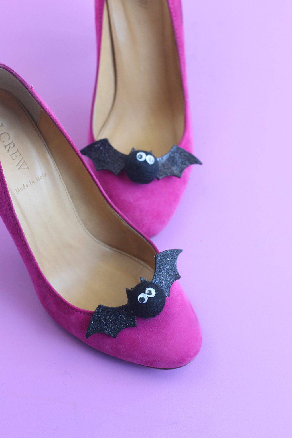 Initially, I made this project without the googly eyes and let me tell you…nothing is creepier than a pair of bats with no eyeballs. It’s not cute. It’s not right. So googly eyes won again. This time with shoes in mind.