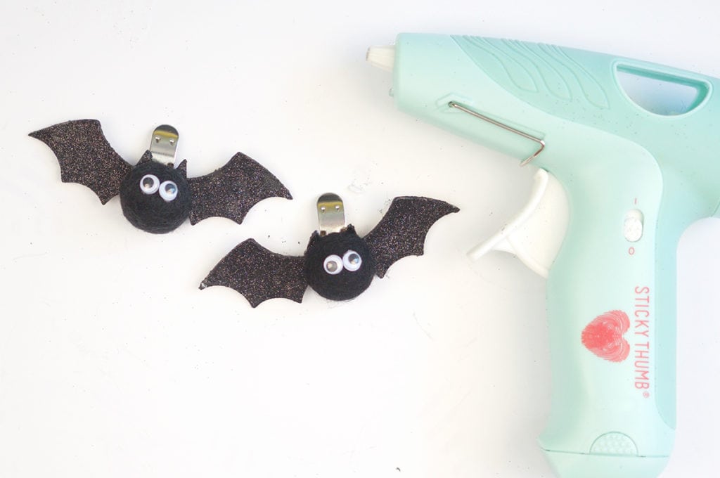 - Hot glue the felt ball half onto the wings of the bat…