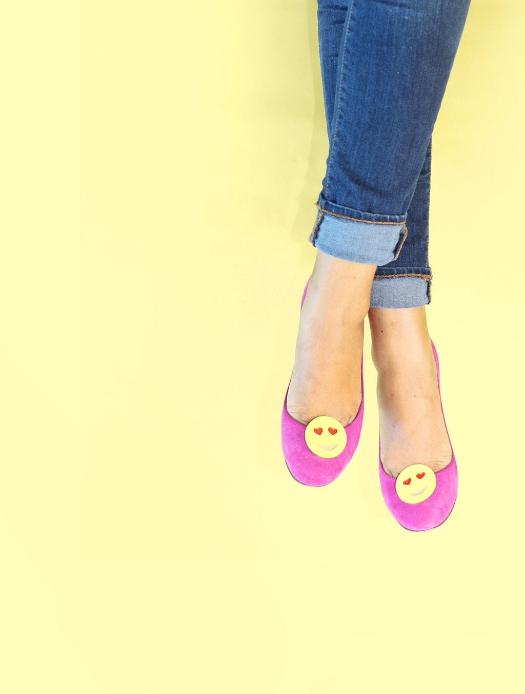 The shoe clip parade continues and emojis are so necessary. To be honest, I haven’t really figured out the whole emoji thing. I guess it has something to do with the fact that I talk a lot, which means I really, really like words. Real words. Words made up from letters. Words that I can put together into a long-winded story about the randomest of things. Like tie-dye outfits. And ugly sweaters. I can still appreciate a well, placed emoji, though. I use them a ton on Instagram, but now I’m crafting with them in another Craft My Flats original. It had to be done.