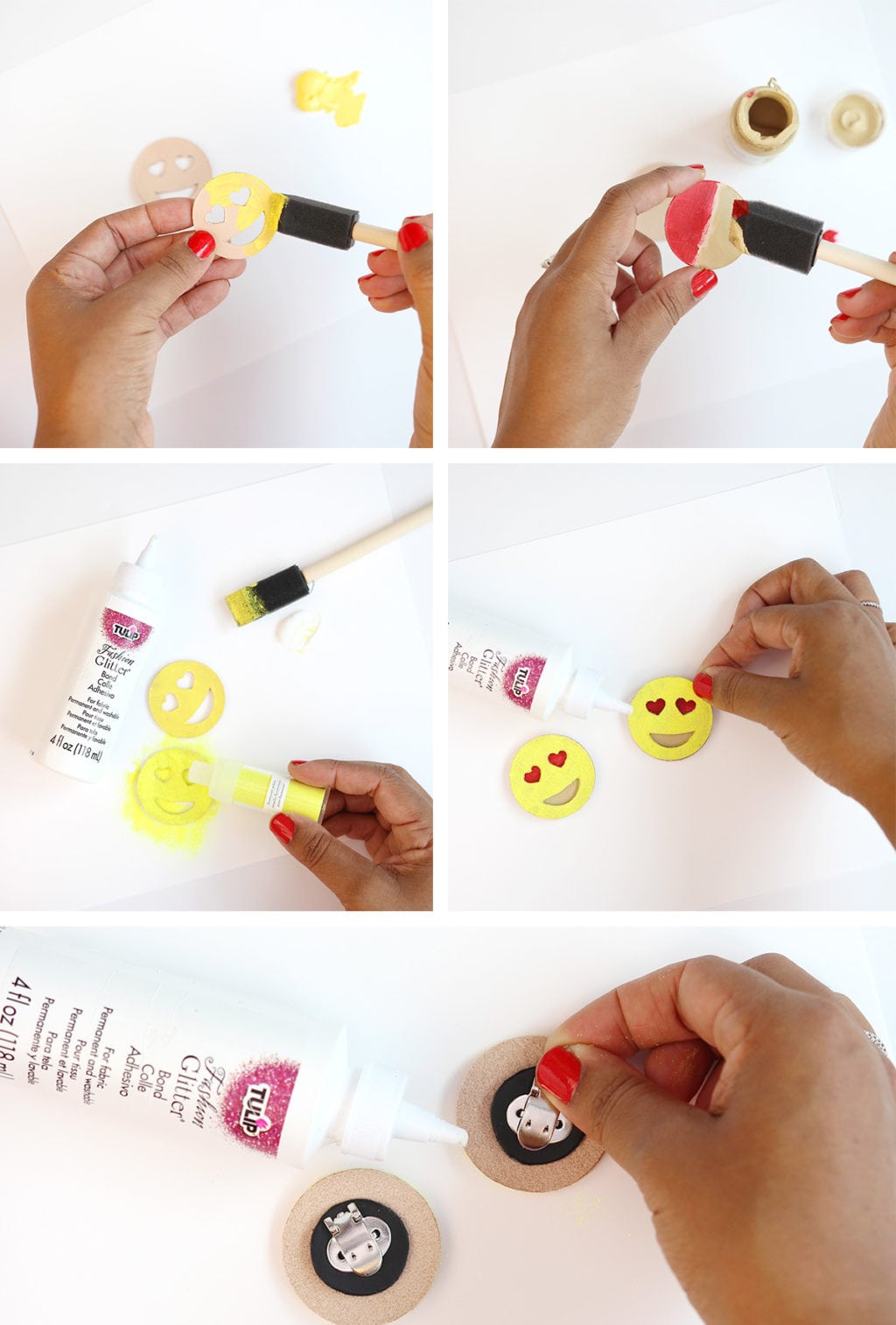 - Brush glitter bond glue on to the emoji faces then sprinkle with yellow glitter
