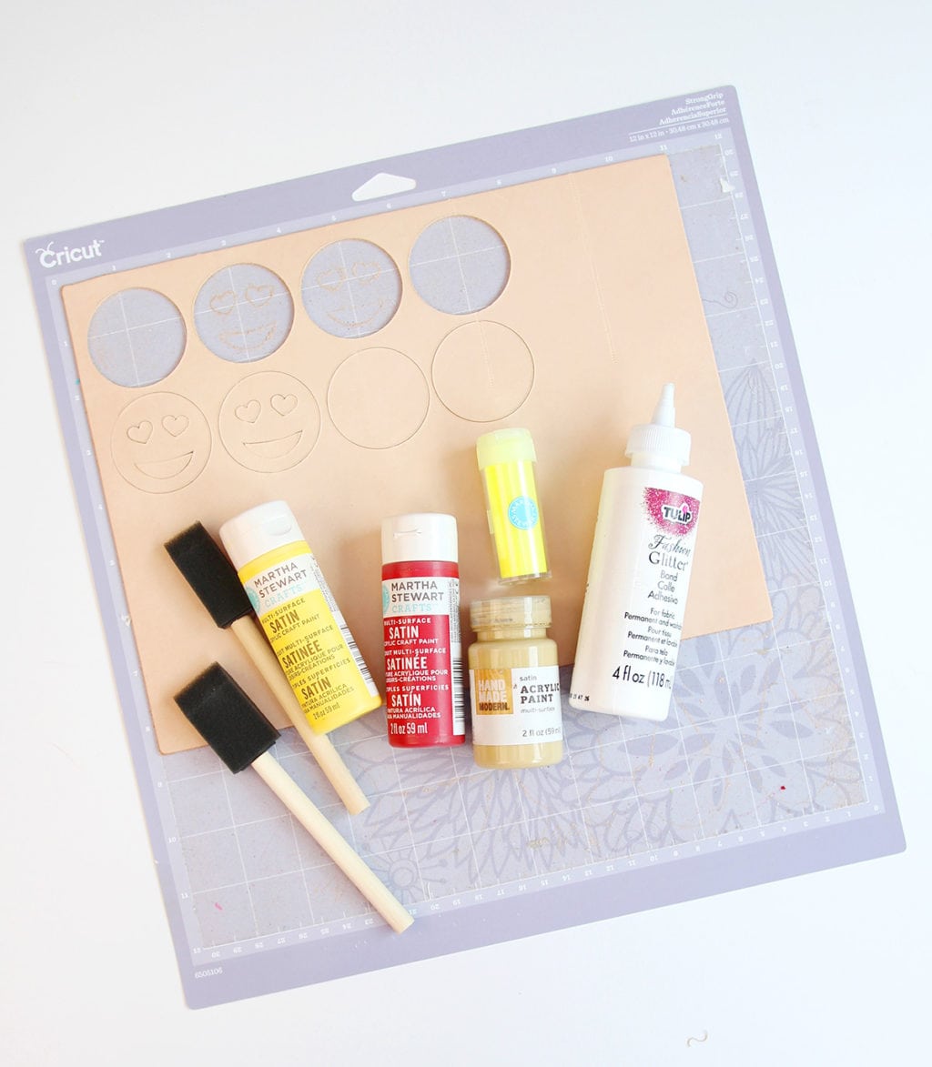 - Emoji shapes and circles cut from tooling leather using the Cricut Explore (click the link to grab the cutting file for this project, then set your machine to the “Leather -Heavy” custom setting)