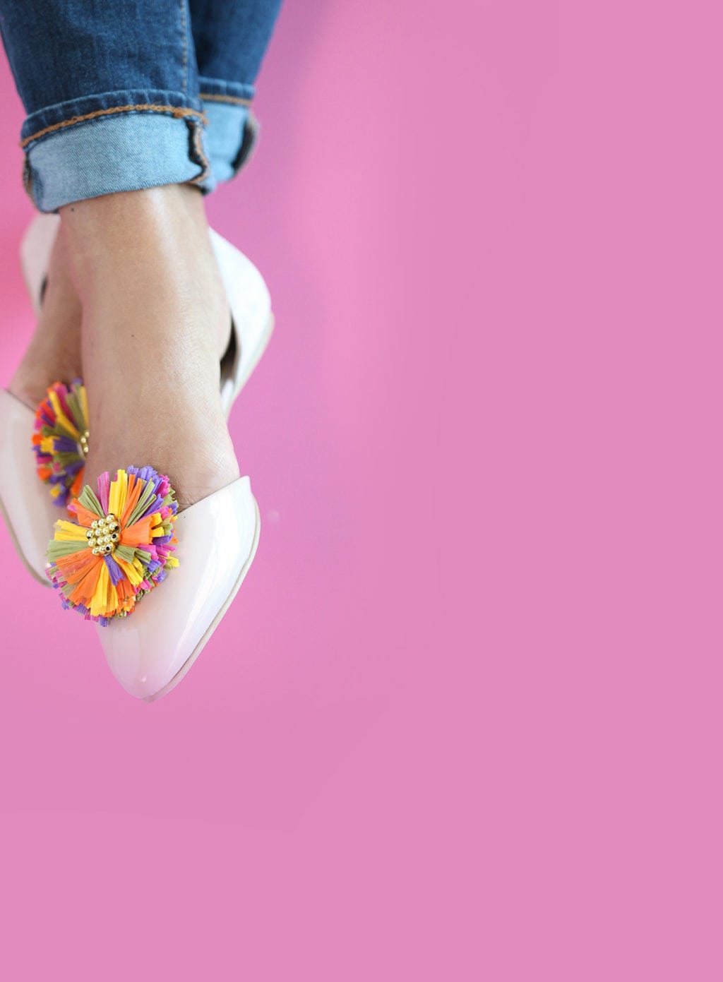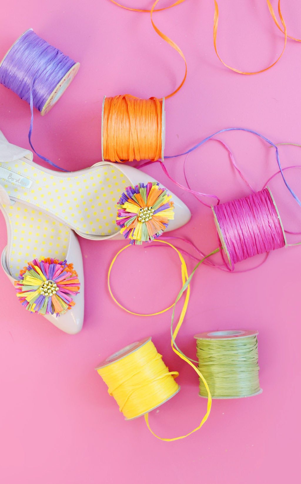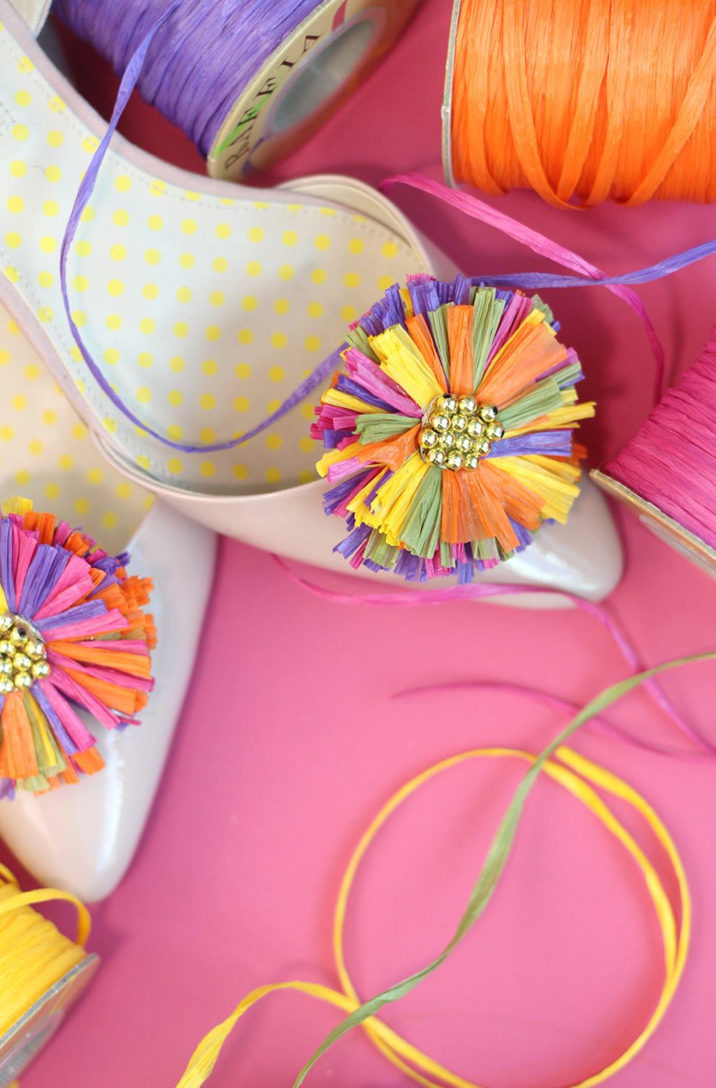 Raffia actually has nothing to do with a middle-aged man strumming a guitar and singing children’s songs, but has everything to do with spools of wrinkled paper ribbon just begging for a makeover. Raffia is kind of sad on it’s own. It’s sad the way cottage cheese is sad until you add some fruit. Raffia just needs a little help. A boost. It needs to be bunched together into a shoe clip – then it instantly become aweseomesauce. When I saw these shoe clips, I knew I could recreate them in no time. So I did…and now I will show you how to do it too.