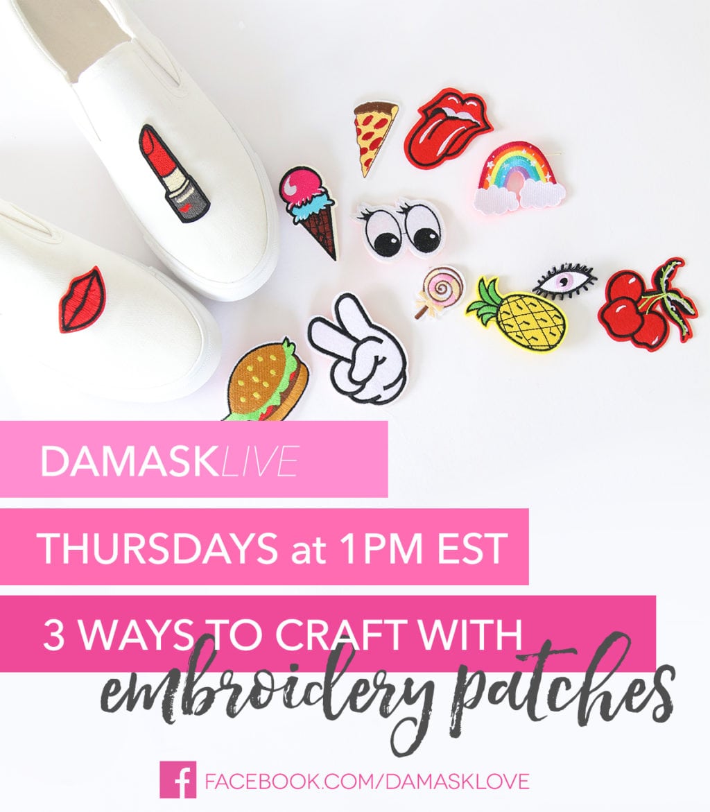 Instead of going out to “get” this elusive television show, I’ve given myself my own. It’s called Damask Live and it “air” Thursdays at 1PM EST on the Damask Love Facebook Page. It’s the craftiest fifteen minutes of your week and it’s so much fun for me to craft and chat with all of you! Last week on Damask Live we made a magnet board using a pizza pan!! This week, we’re crafting with embroidery patches in unexpected ways. Join me. It’s a great time. Commercial free.