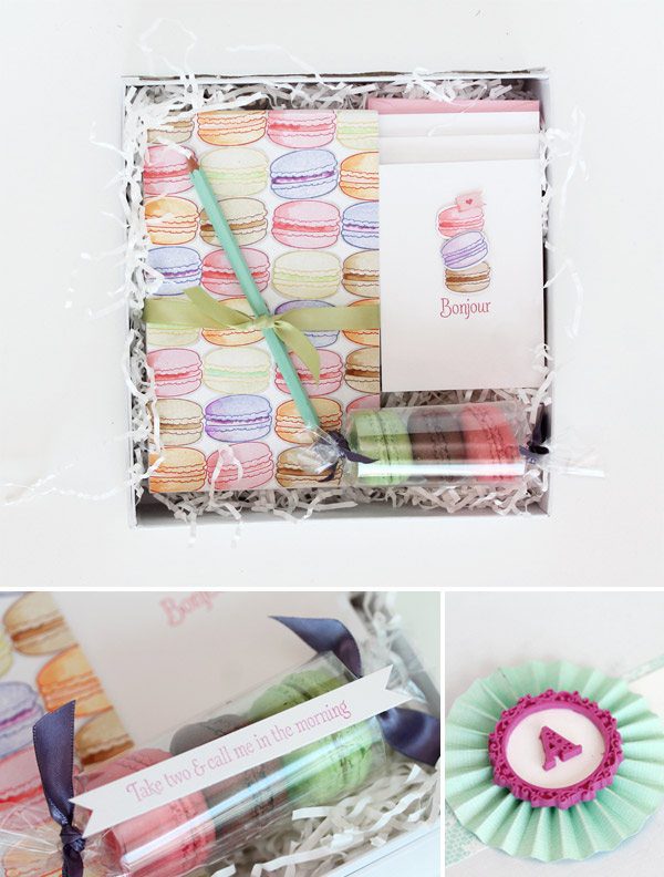 It’s no secret that I love “in a box” projects. I’ve done Rustic Winter in a box, Spread the Love in a box and now …I’ve packed up the yumminess of Parisian macarons and put ’em in a …you guessed it…box.