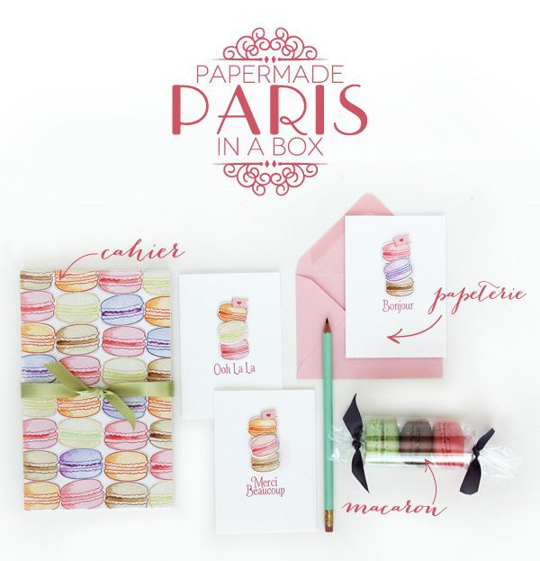 To commemorate our awesome trip, I decided that today’s Craftroom Crush was just too perfect. Avery Elle’s “Bonjour” stamp set is exactly what I’ve been looking for. I’ve been on the hunt for a macaron stamp for ages but haven’t found any that I like…until I found this one. It only makes sense that I’d share my project using this set on the day that we set off for Paris: A Papermade Paris in a Box