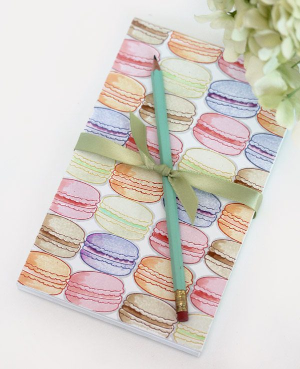 {1} Notebook cover with should measure 2″ – 2 1/2″ taller than your stack of note paper sheets. I created my notebook cover with a piece of chipboard which I covered with white cardstock and stamped with a macaron pattern.