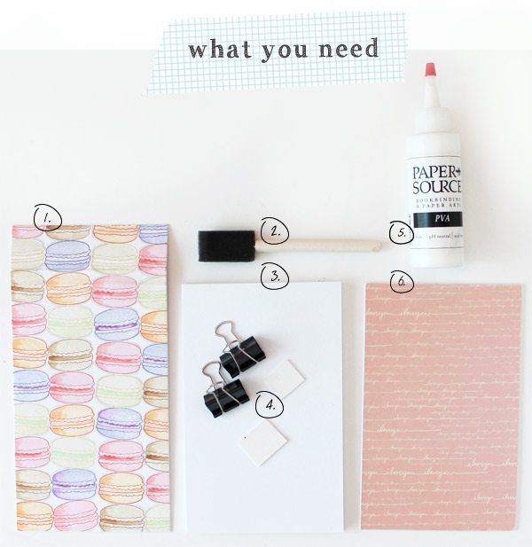 {6} Thick artboard for the backing of the notebook. I covered mine with patterned paper that coordinates with the macaron design on the cover.