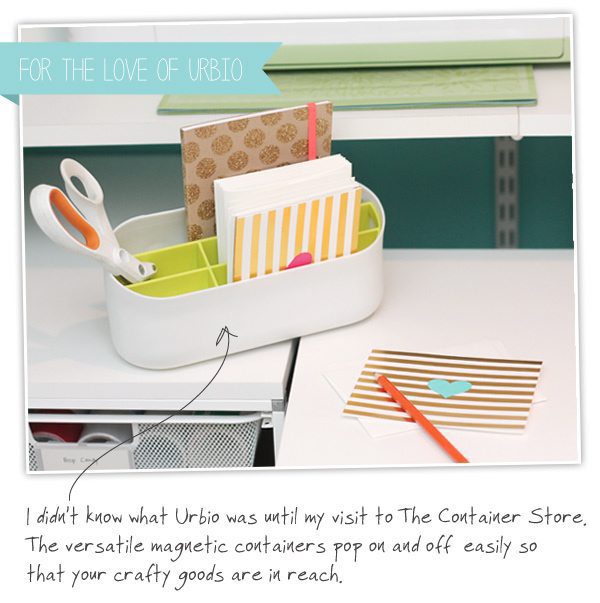 Urbio Magnetic Modular System can be used in approximately 7 bajillion ways. The magnetic wall plates screw directly into your wall and there are several different containers that you can choose from for storing your goods. For my set up, I chose the Wide Mouth and Shorty containers for holding pens, scissors and notebooks. I love that the containers can be pulled off of the wall plate for me to bring over to my workspace.