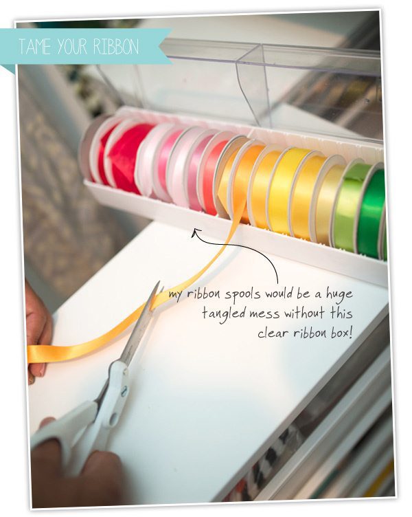 On the shelves above the electronics, I’ve organized my ribbon, envelopes, felt, stickers, adhesives, inkpads, letterpress supplies…and more! It’s pretty unbelievable how much stuff can be stored in the Clear Shirt Drawers and Clear Shoe Drawers. I was especially excited when I realized that I could store fifteen HUGE spools of ribbon in just one of the Clear Shirt Drawers. The dividers make it easy to keep the ribbon spools in place and all I have to do is pull out the drawer from it’s base to snip off a length of ribbon.