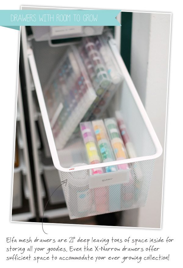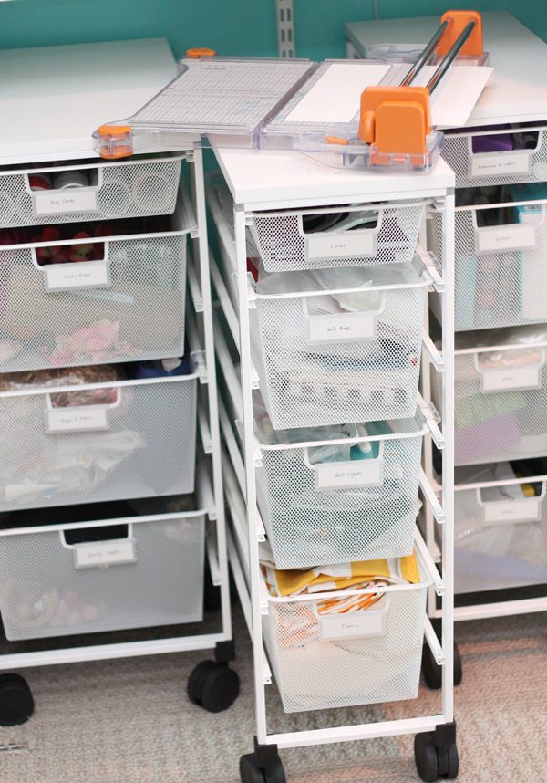 By having the drawer units on casters, I’m able to have another workspace, which I love! I frequently pull out the middle drawer unit and use the white melamine top for trimming cardstock or cutting ribbon.