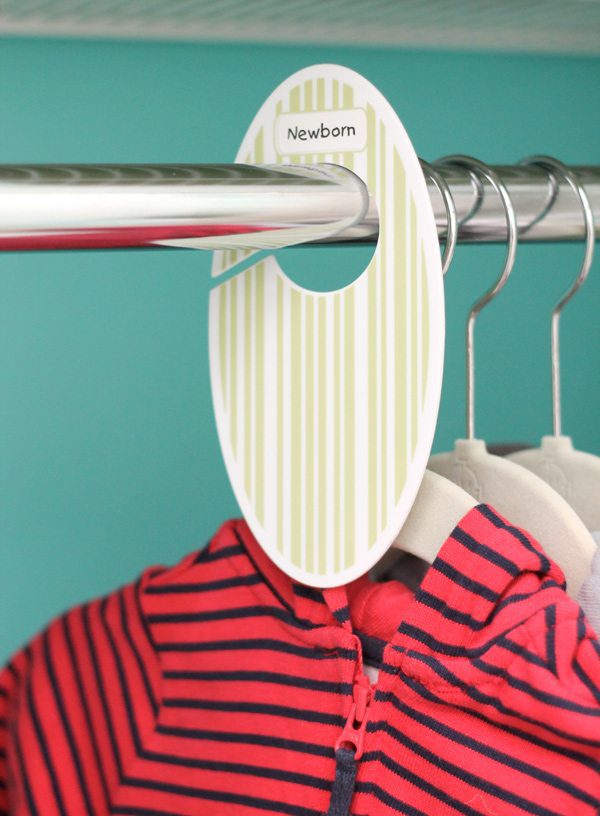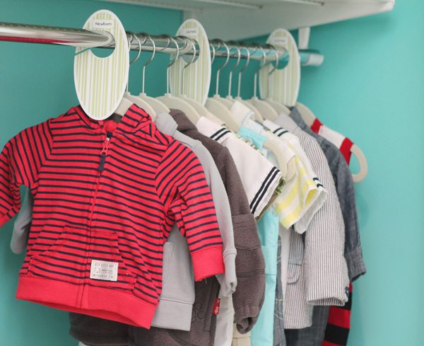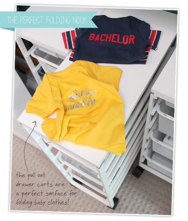 On the baby side of the closet, I have the exact same drawer units which pull out on casters. It’s a great place to fold up baby clothes and each of the drawers has plenty of room for all those baby necessities like diapers, hats, socks and shoes.