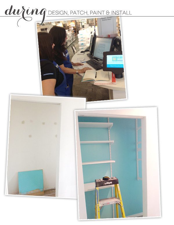 I established the problems…so the next step was to take all my measurements to The Container Store where the Elfa geniuses worked their magic and designed a way more awesome space that would work for all of my needs. It took about an hour to design the entire space, including the time they spent helping me decide on which storage drawers and boxes would be best. I was beyond impressed with the patience and knowledge of the staff at my local store. They thought of EVERYTHING and had a solution for every snag.