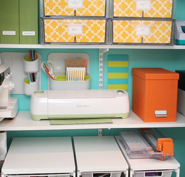 The left side of the closet is dedicated to crafting with a shelf that holds all of my large electronic supplies like my printer, Cricut Explore and my sewing machine. I love that my Cricut has a permanent home and can be used without moving it to another spot. For this shelf, I used the Elfa 16″ deep white melamine solid shelving.