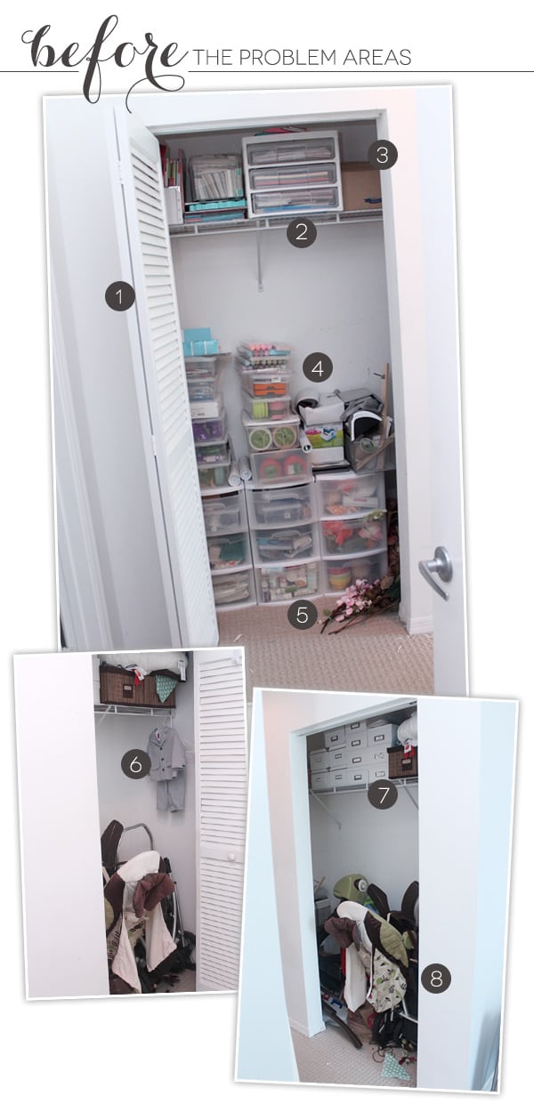 1. See that folding door? It totally got in the way. With space at such a premium, that door was a big problem. Even when it was open, it took up about 4″ of space in the closet opening which meant I couldn’t fully open the plastic drawers inside.