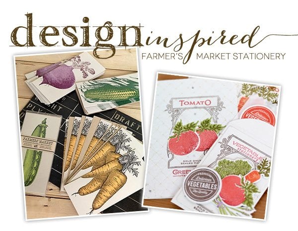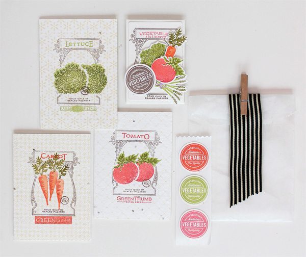 Today’s project is a tricky way to give your projects new life. By stamping on plantable paper, each card is transformed into a garden beauty…which is majorly more awesome than the garbage can. I’ve seen lots of professional stationery featuring fruits, veggies and other farmer’s market faves. With the help of Papertrey Ink’s Vegetable Garden stamp set, I set out to create my own handmade version.