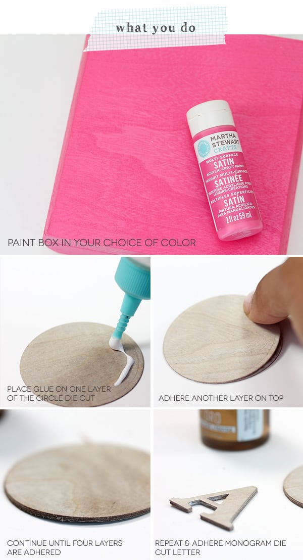 {A Note About Supplies} – You can find most of these supplies at Michael’s. I was able to find thin sheets of birch, which is thin enough to cut in a manual die cutting machine, but sturdy enough to hold up nicely to a decor project like this. The box and gilding is also available there. Be sure to scroll down to the supply list at the bottom of the post to see which dies I used to cut out the circle & monogram shapes.