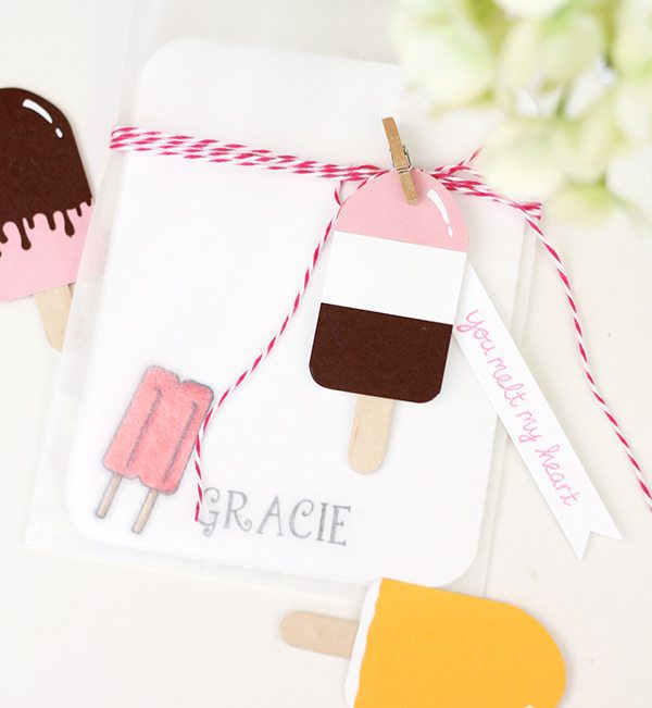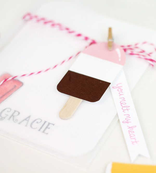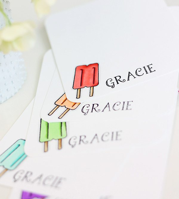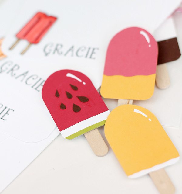 I have no doubt that you can come up with a ton of ways to use these little popsicles. I opted to simply clip mine to the outside of a handmade set of children’s stationery featuring a coordinating popsicle image that I stamped and colored with Copics.